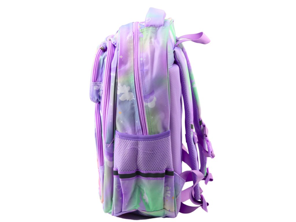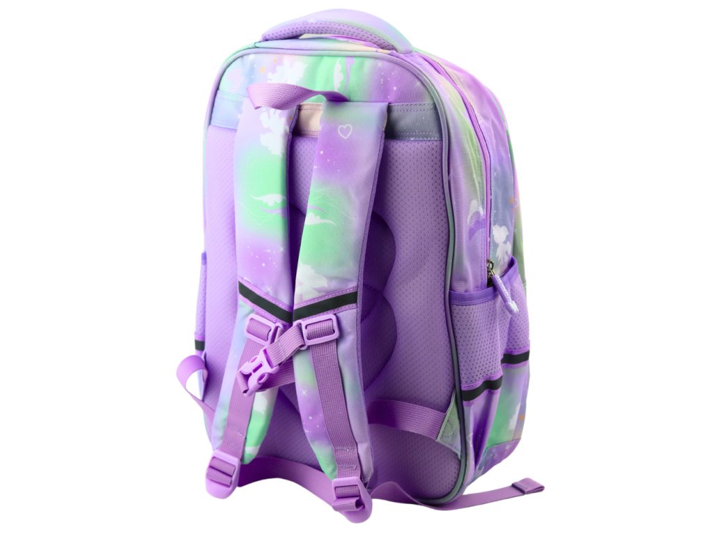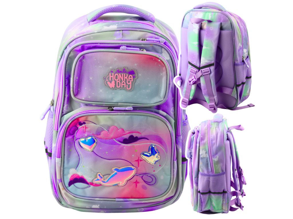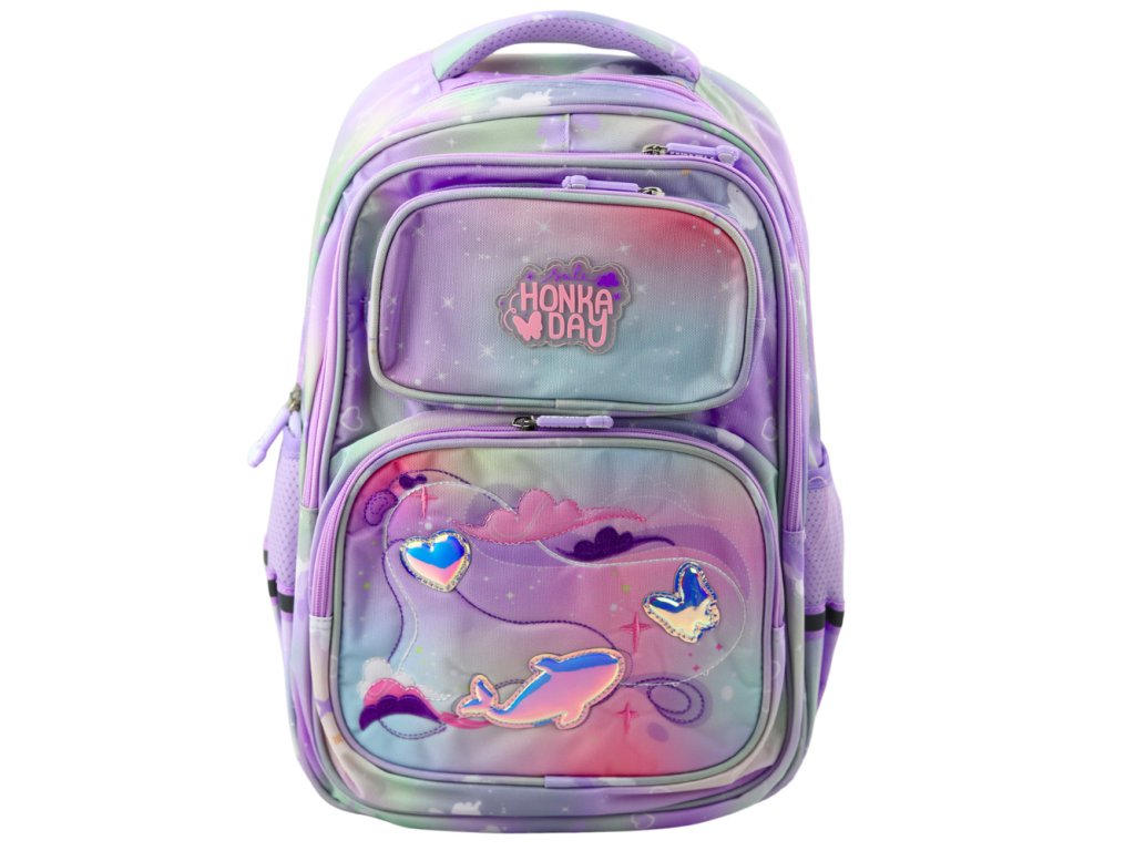 Pastelový školní batoh s nášivkami delfína a srdce Barevný školní batoh v pastelových odstínech modré, fialové a růžové je ideální pro děti, které si cení nejen funkčnosti, ale i stylového a veselého vzhledu Batoh se vyznačuje třpytivými nášivkami ve tvaru delfína a srdce, které mu dodávají výjimečný půvab