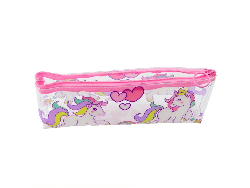 Školní pouzdro pro dívky s transparentním designem jednorožců je okouzlující doplněk do školní výbavy každé malé princezny Průhledné pouzdro s barevnými jednorožci, srdíčky a hvězdičkami přitahuje pozornost a ohromuje svým pohádkovým vzhledem