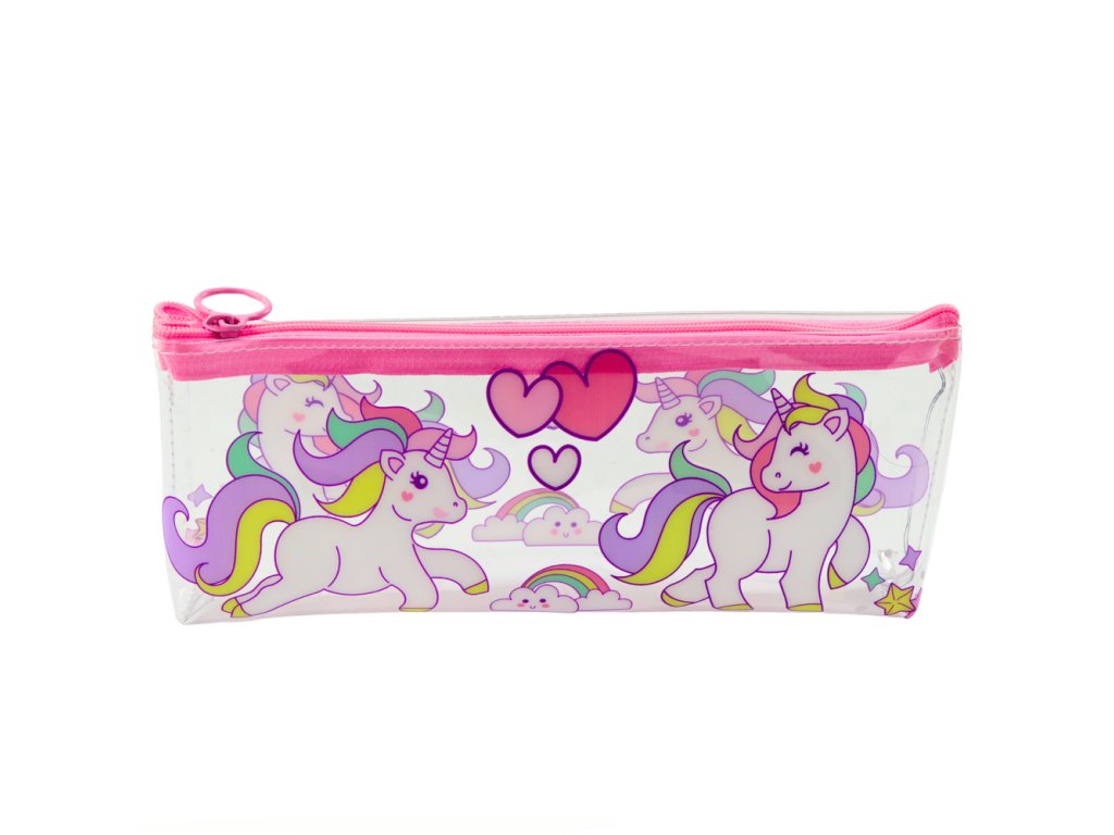 Školní pouzdro pro dívky s transparentním designem jednorožců je okouzlující doplněk do školní výbavy každé malé princezny.