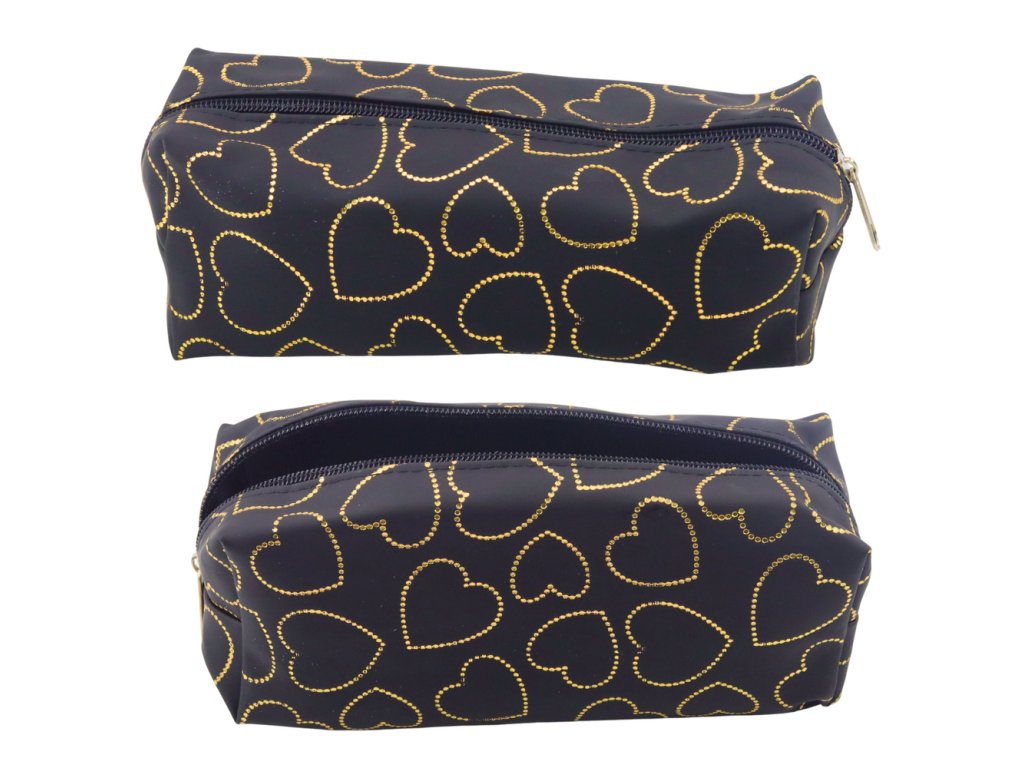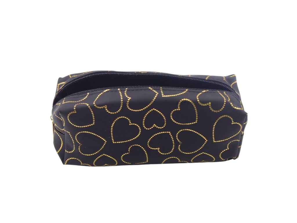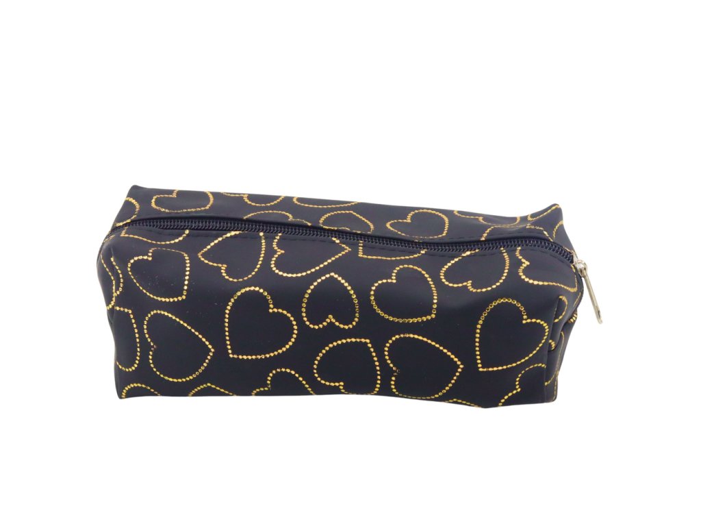 - Černý penál se zlatými srdíčky je stylový a funkční doplněk v elegantní černé barvě, ozdobený jemným vzorem zlatých srdcí