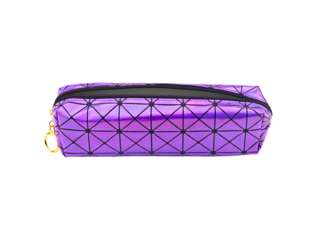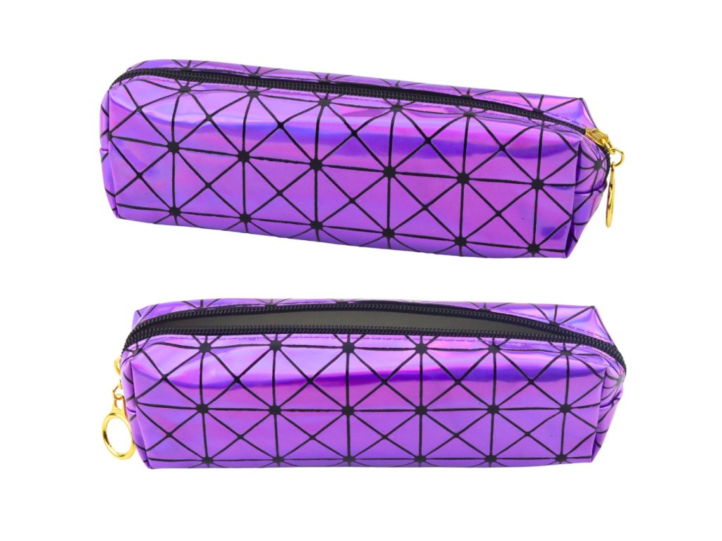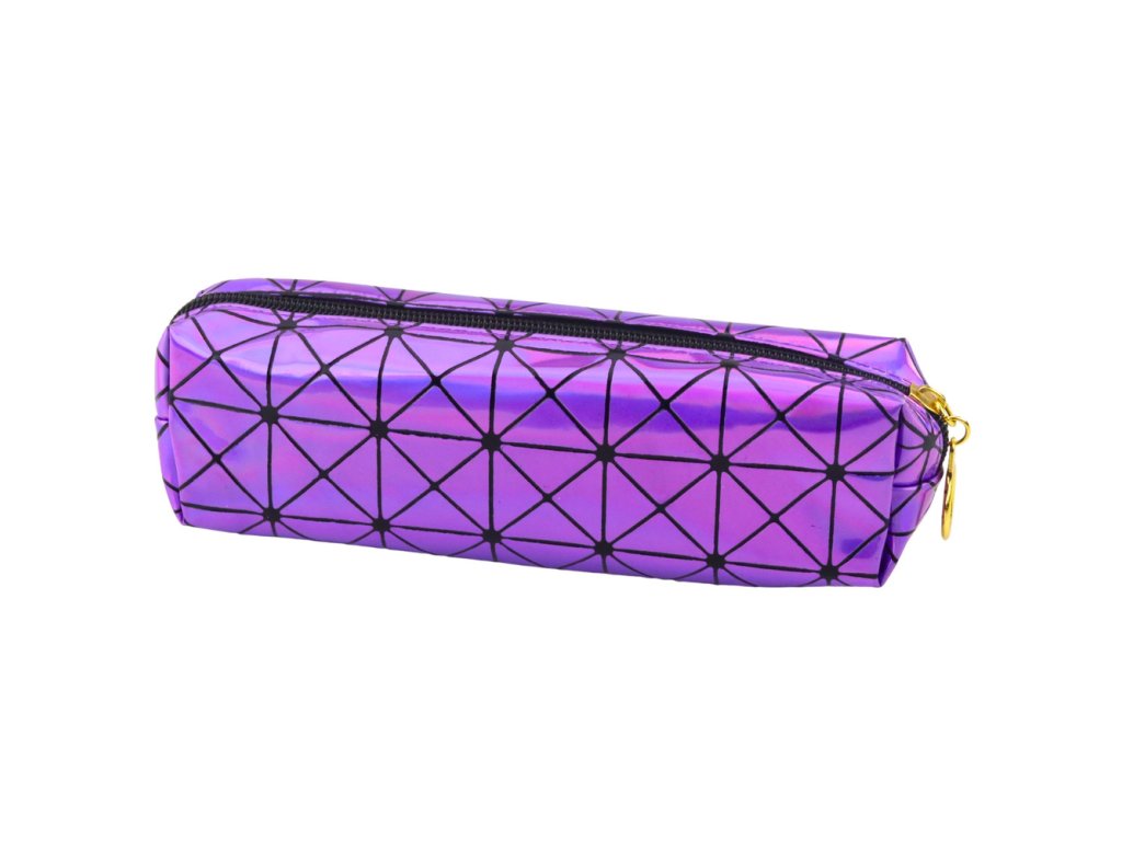 - Fialový holografický jednokomorový penál je moderním a stylovým doplňkem ke školním i kancelářským potřebám, který přitahuje pozornost lesklým povrchem a geometrickým vzorem