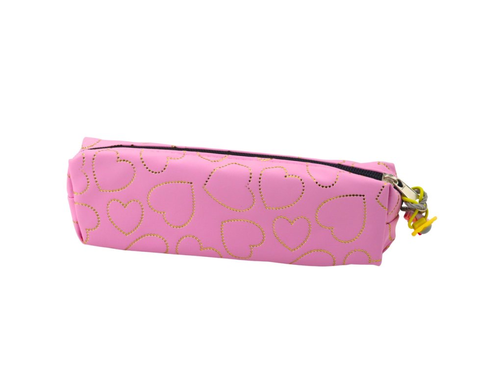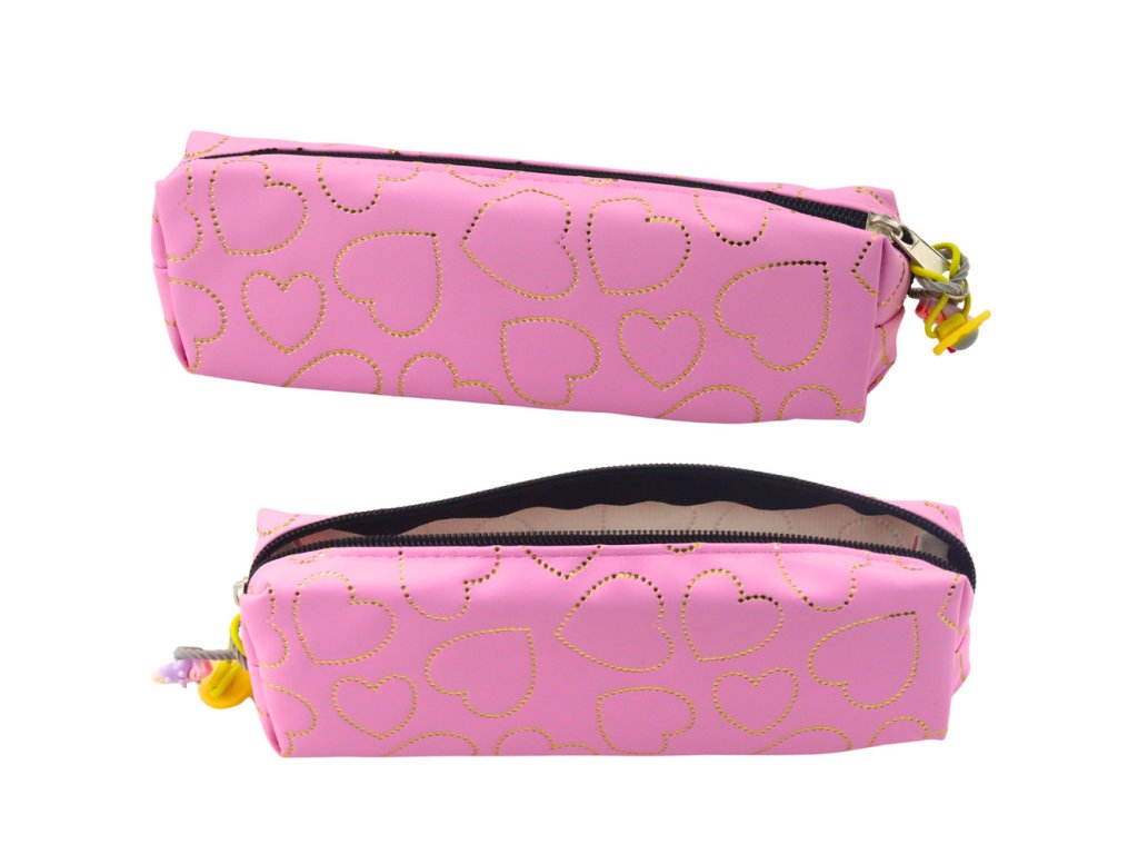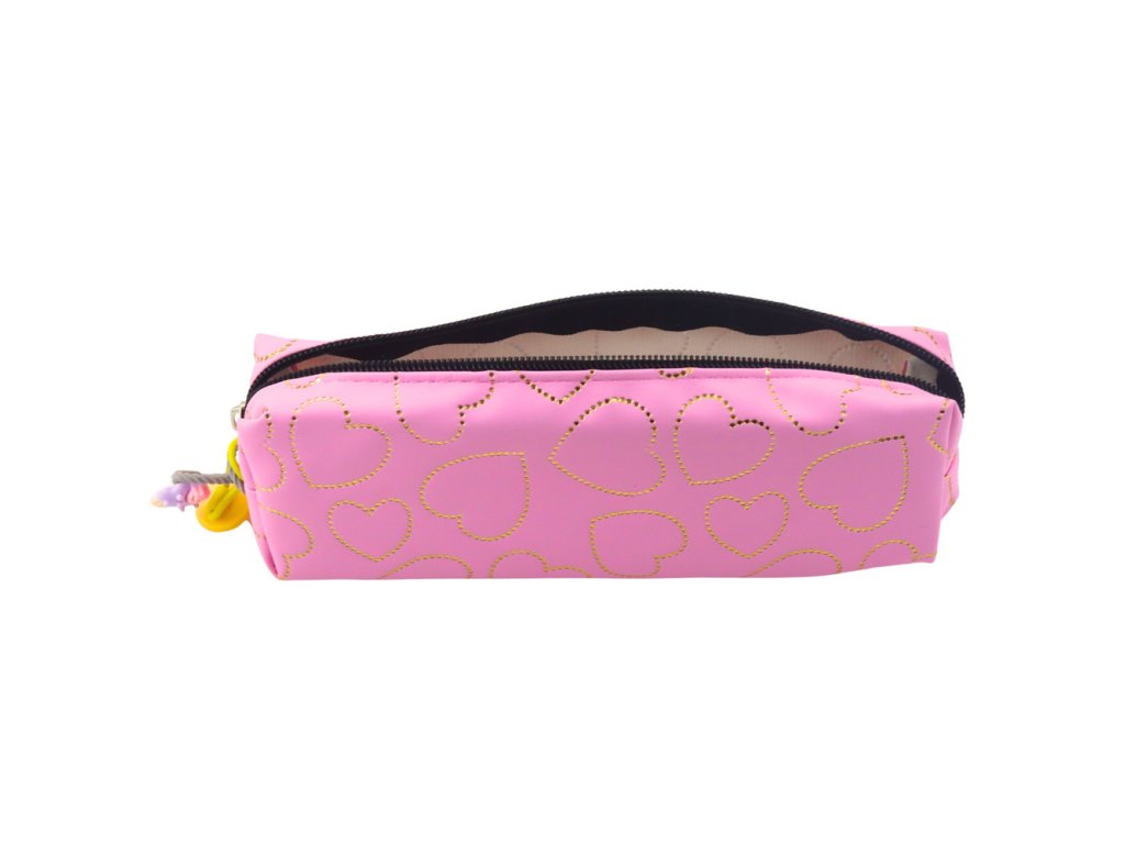 Růžový penál se zlatými srdíčky je stylový a praktický doplněk, který se ideálně hodí do školy, na univerzitu i do kanceláře.