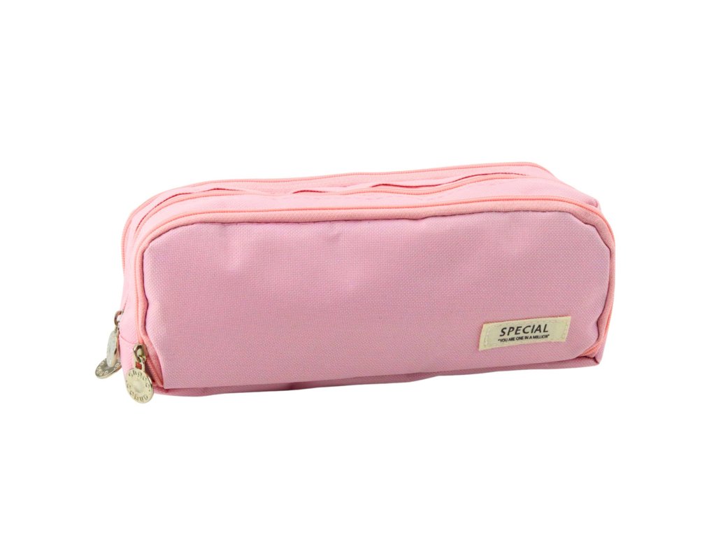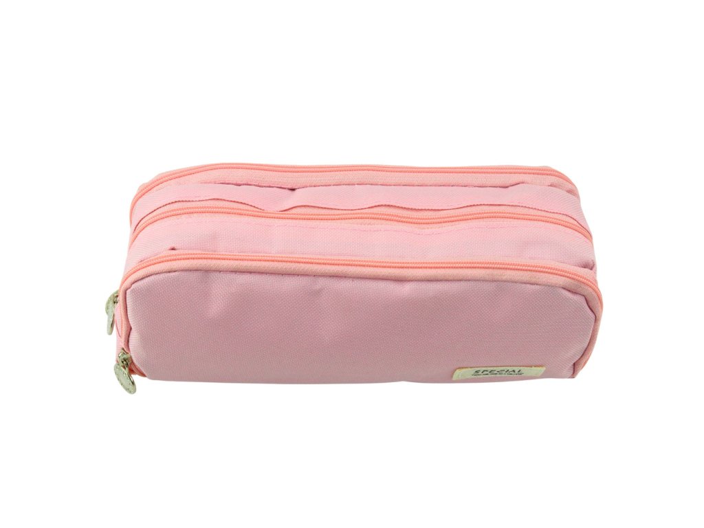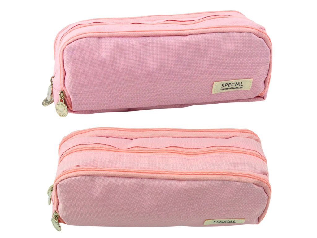 Školní penál dvoukomorový s přední kapsou růžový Praktický a estetický dvoukomorový penál je ideálním řešením pro studenty, žáky a také pracující osoby Díky dvěma odděleným komorám a přídavné přední kapse na zip umožňuje snadné uspořádání psacích potřeb, výtvarných a kancelářských pomůcek
