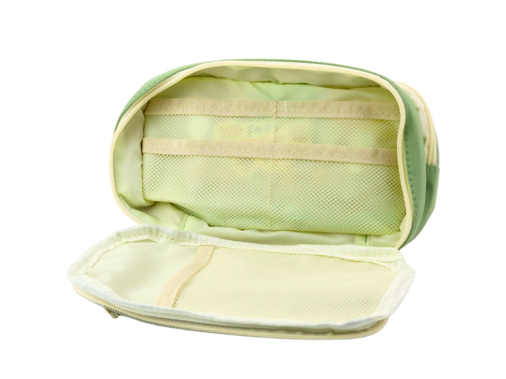 Každá z komor je uzavíratelná na zip, což zajišťuje bezpečné ukládání per, tužek, pastelek či pravítek Uvnitř se nacházejí síťové kapsy, ideální pro menší předměty, jako jsou gumy, ořezávátka, sponky nebo jiné drobné příslušenství