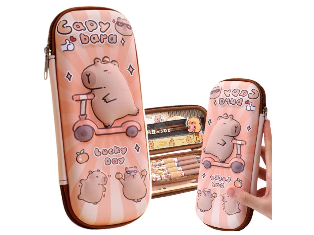 - Školní penál Kapybara na koloběžce 23 cm je prostorný a stylový penál s motivem rozkošné kapybary na koloběžce, ideální volba pro milovníky zvířat a kreativního stylu