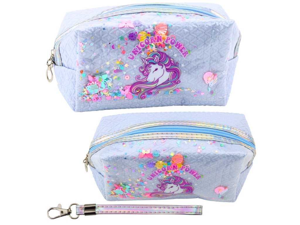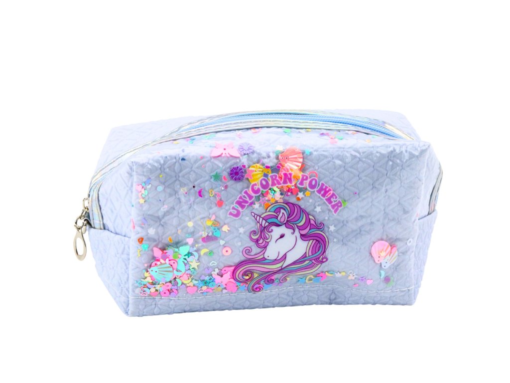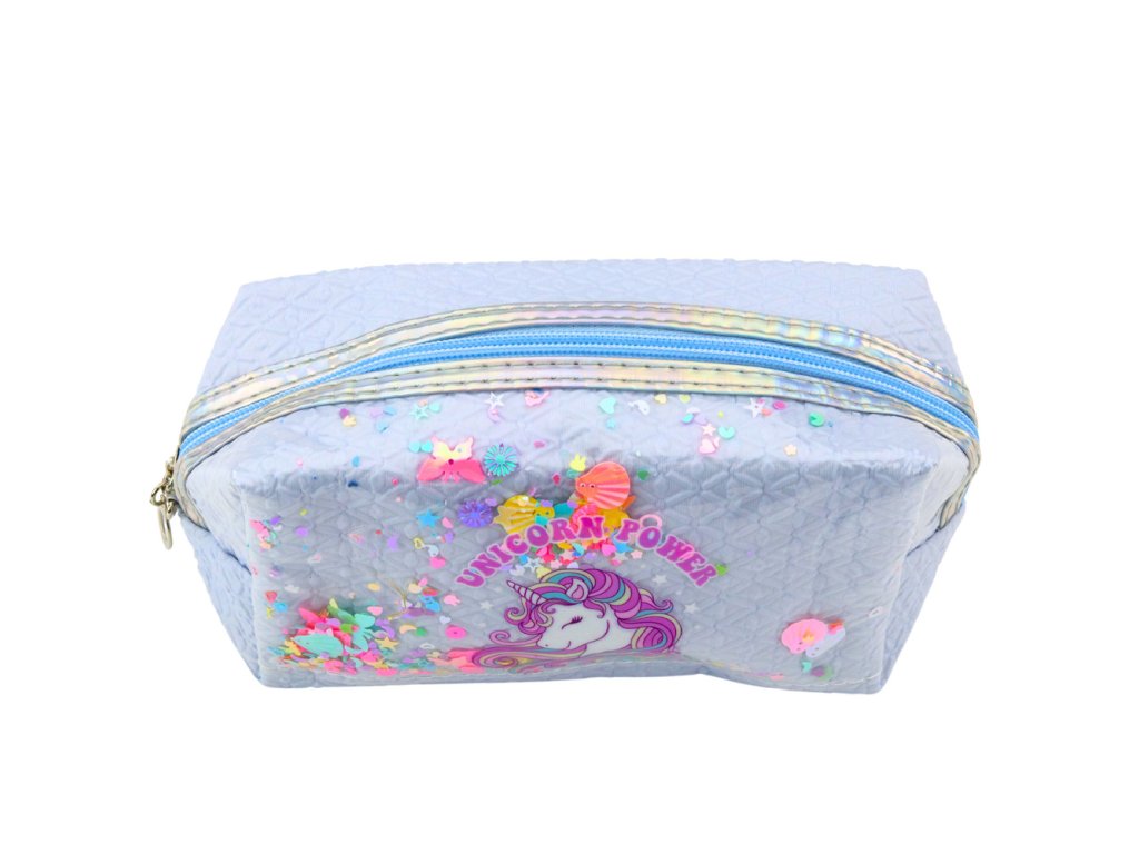 Školní penál s přívěskem Jednorožec Konfety Modrý je výjimečný a praktický doplněk pro každé dítě, které si cení estetiky, funkčnosti a kouzla pohádkových vzorů Vyroben s důrazem na každý detail, zaujme originálním potiskem s motivem jednorožce a transparentním okénkem s barevným konfety, které se při pohybu přesouvá a vytváří jedinečný vizuální efekt
