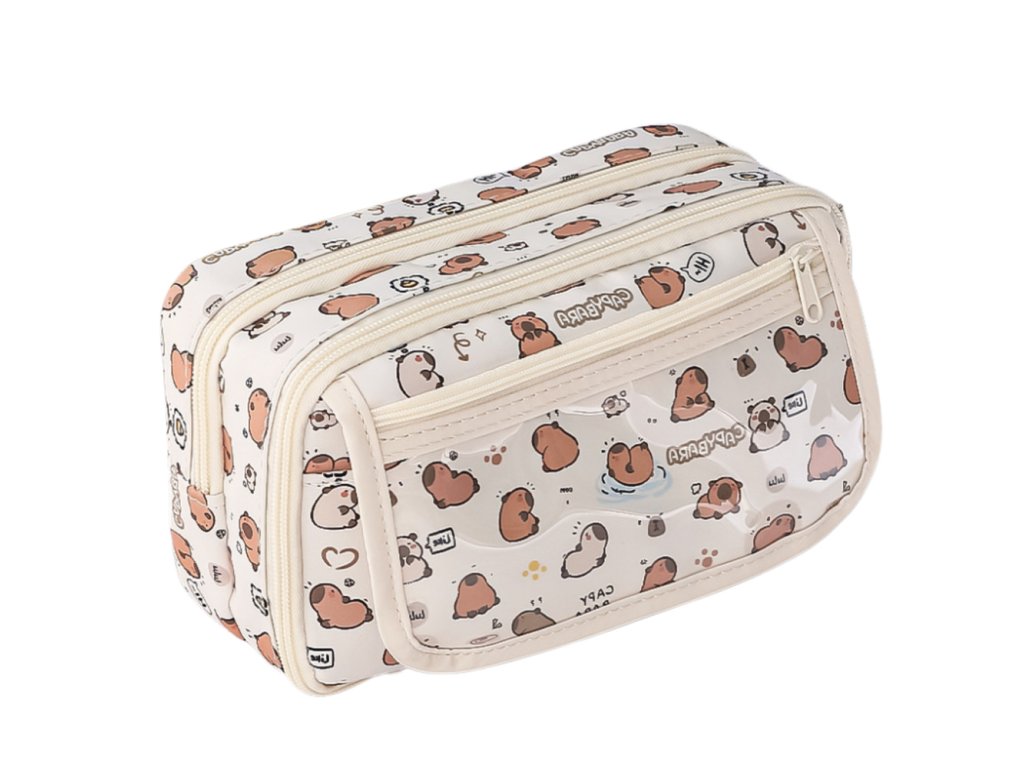 Školní pouzdro s kapibary, bílé je ideální volbou pro studenty, kteří ocení praktický a rozkošný design V krémové barvě s obrázky sympatických kapibar toto pouzdro snadno vynikne mezi ostatními školními potřebami