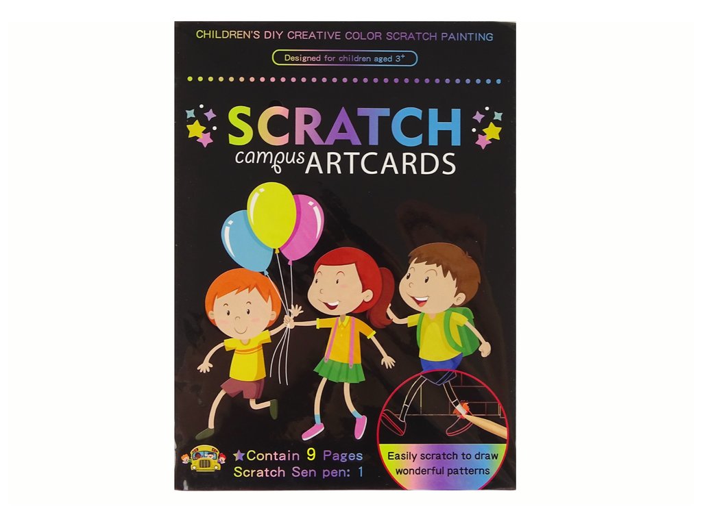 V sadě najdete 9 obrázků k odškrabávání, které ožívají před očima dítěte Hra je jednoduchá: pomocí speciálního dřevěného tyčinky můžete seškrábat černou vrstvu na obrázku a odhalit krásné a barevné ilustrace