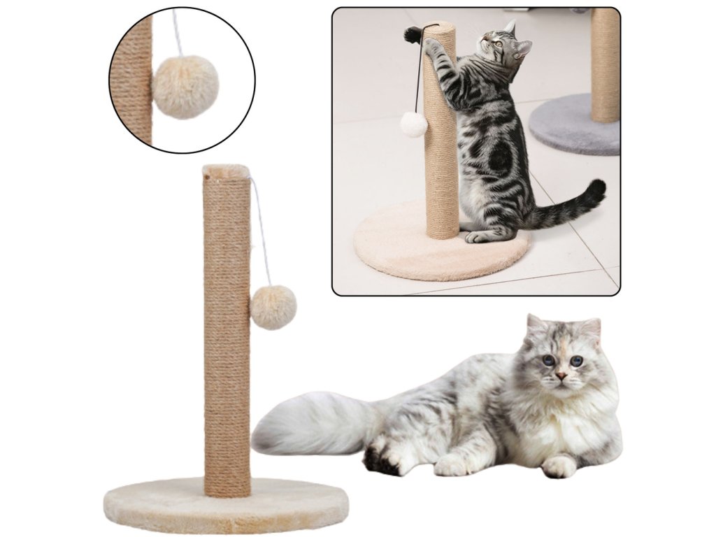 - Sloupek potažený sisalovým provazem a visící provázek s pomponem představují ideální řešení pro broušení drápků a hru