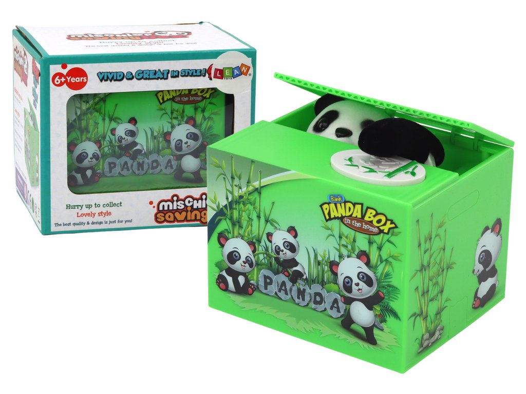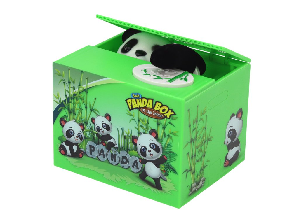 - Když dítě umístí minci na tlačítko a stiskne jej, z vrchní části krabičky se objeví roztomilá panda, která minci vezme dovnitř