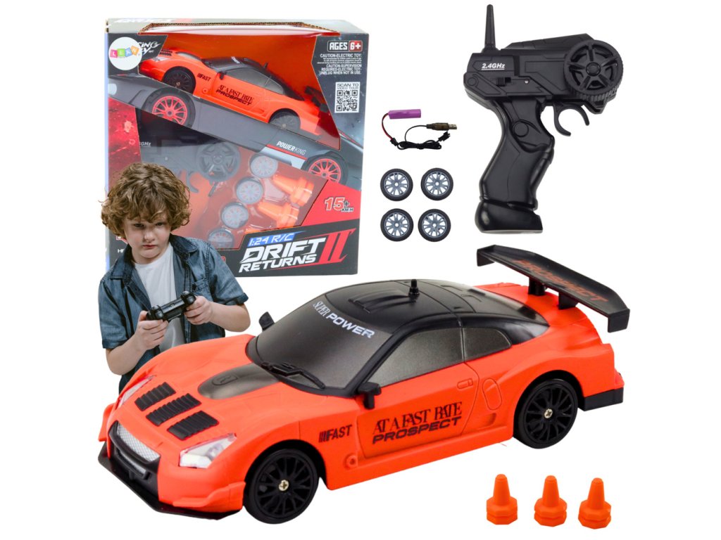 - Sportovní RC Auto 1:24 Oranžové s Výměnnými Koly je perfektním doplňkem pro každého malého závodníka
