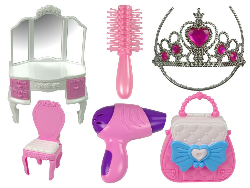 - Různé doplňky: fén, kartáč, korunka a kabelka s modrou mašlí