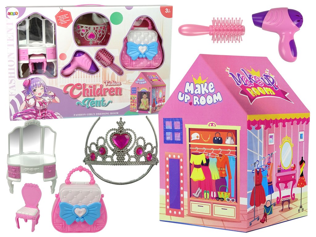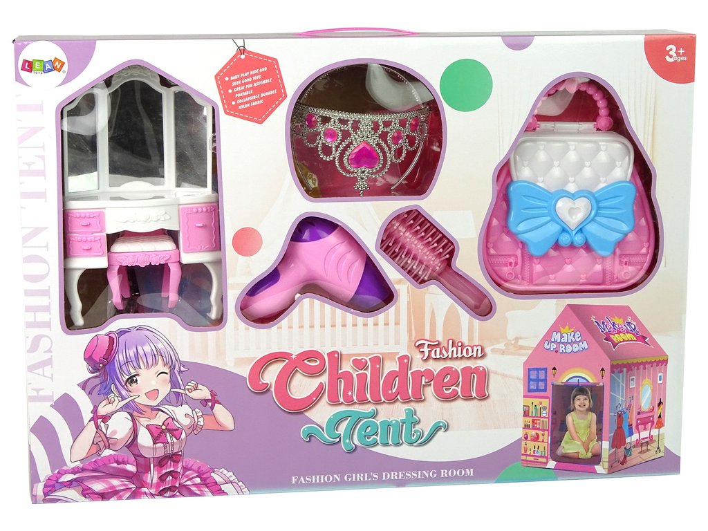 Princeznin stan pro děti Salon krásy Růžové doplňky Koruna Krásný stan pro malou princeznu! Každá malá holčička ráda napodobňuje maminku, sleduje, jak se krásně líčí nebo česá
