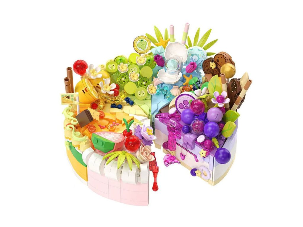 - Každá sada obsahuje od 292 do 357 prvků, které umožňují postavit barevný kousek dortu s detaily připomínajícími ovoce, krémy, polevy a dekorace
