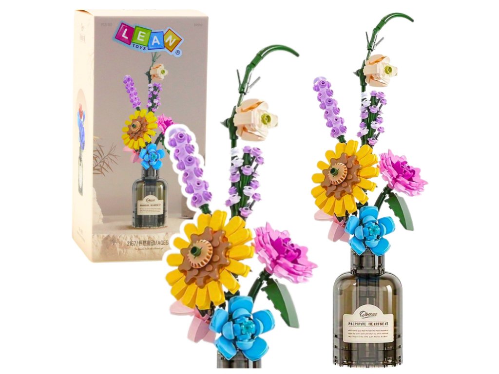 Objevte kouzlo konstrukční stavebnice s touto barevnou kyticovou sadou obsahující 387 dílů! Vytvořte si nádhernou kompozici různorodých květin včetně dominantního slunečnice, modré růže, fialové levandule, pastelových karafiátů a jemných floristických doplňků, které do vaší domácnosti přinesou letní pohodu a energii. Hotový buket je zasazen do stylizované poloprůhledné lahve s ozdobnou etiketou, připomínající elegantní flakon parfému. Je to perfektní dekorace pro obývací pokoj, ložnici, kuchyni nebo pracovnu a zároveň kreativní zábava pro děti, mládež i dospělé.