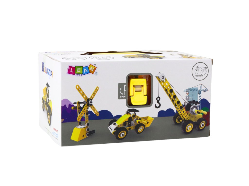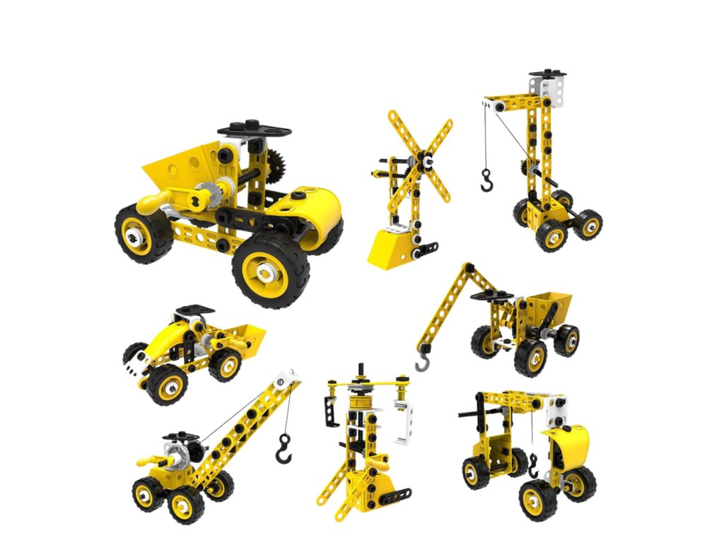 - Tato univerzální sada nabízí až 8 různých modelů stavebních strojů, jako jsou bagry, jeřáby a sklápěčky, které děti mohou sestavit samostatně s pomocí přiloženého nářadí