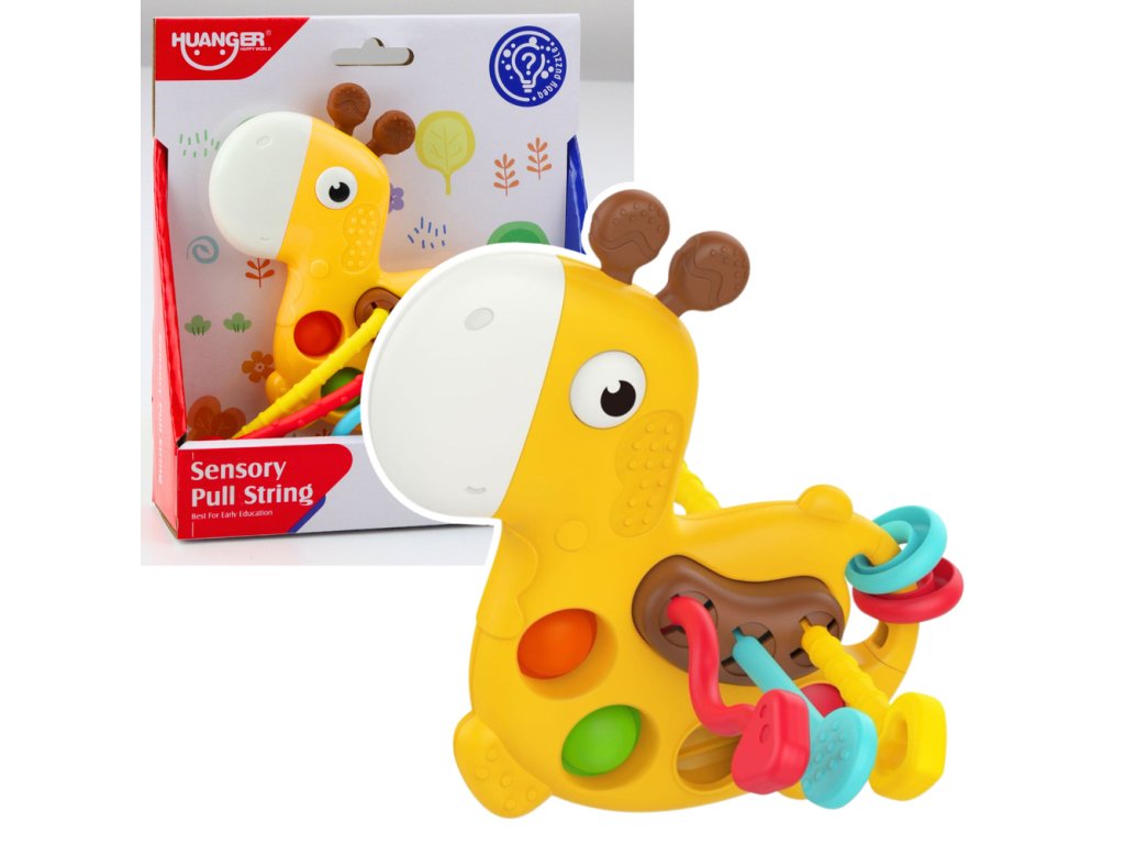 Tahací žlutá smyslová hračka Žirafa s šňůrkami