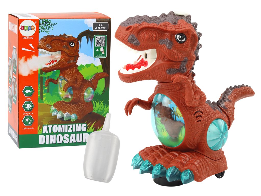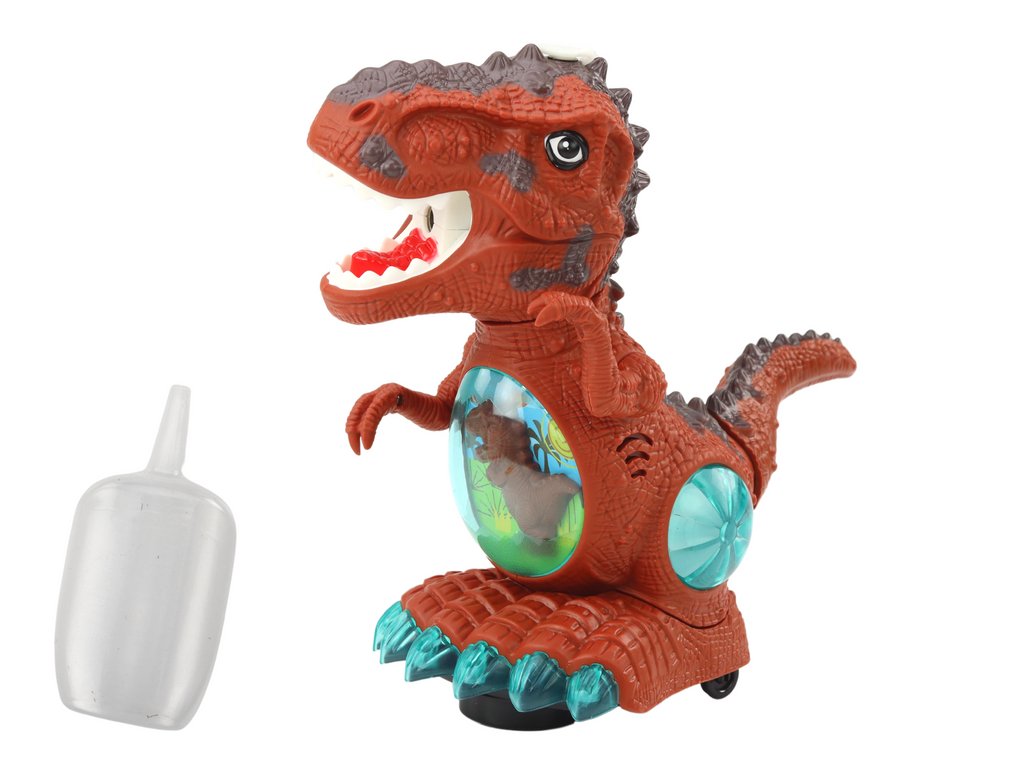 energicky se pohybuje po povrchu, osvětluje jej barevným světlem a vydává zvuky řevu Poté se přidá veselá hudba, jejíž rytmus dodává dinosaurovi ještě více života!