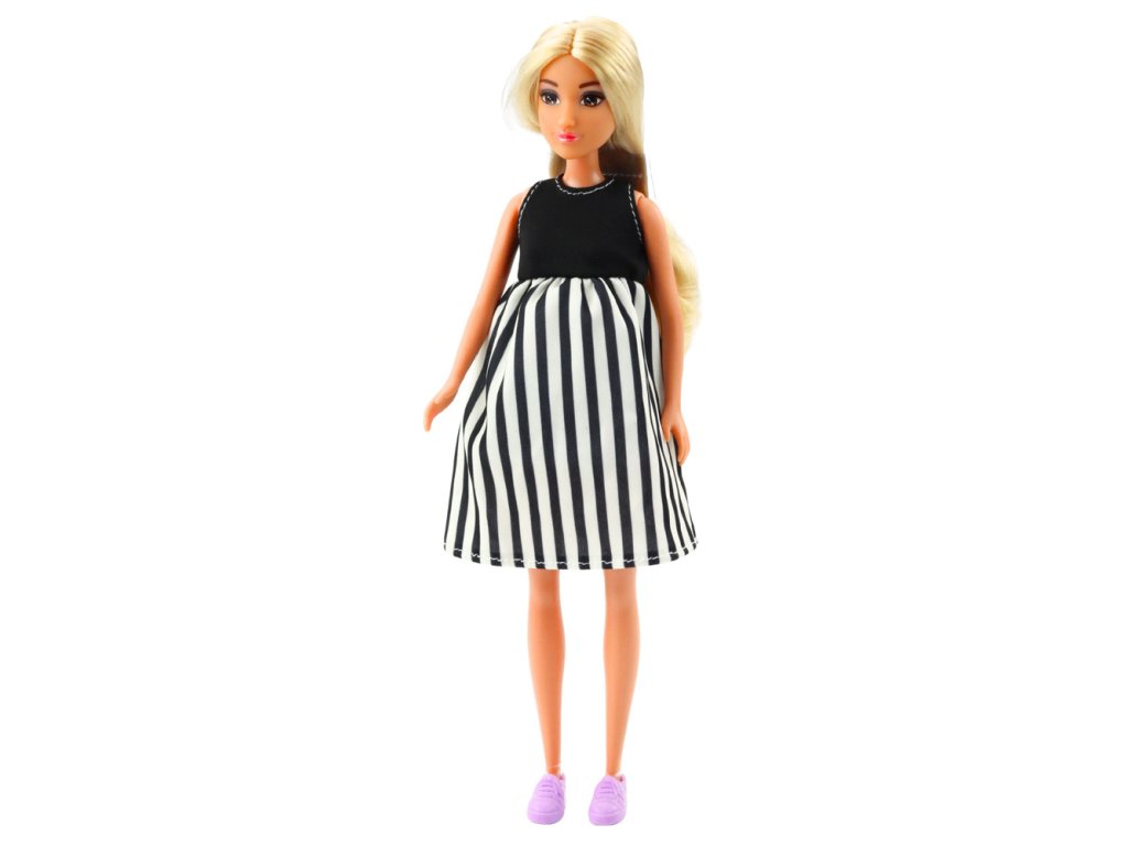 - Stylová a jemná panenka má elegantní dlouhé šaty s černobílými pruhy, které podtrhují její krásu
