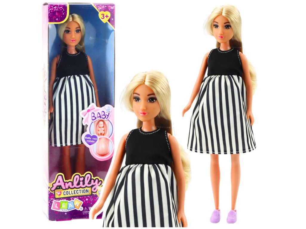 Lalka Anlily v těhotenství je výjimečnou nabídkou, která umožňuje dětem hrát reálné a empatické rodinné scénáře Oblékána v elegantní dlouhé šaty s klasickými černobílými pruhy, vypadá stylově a jemně