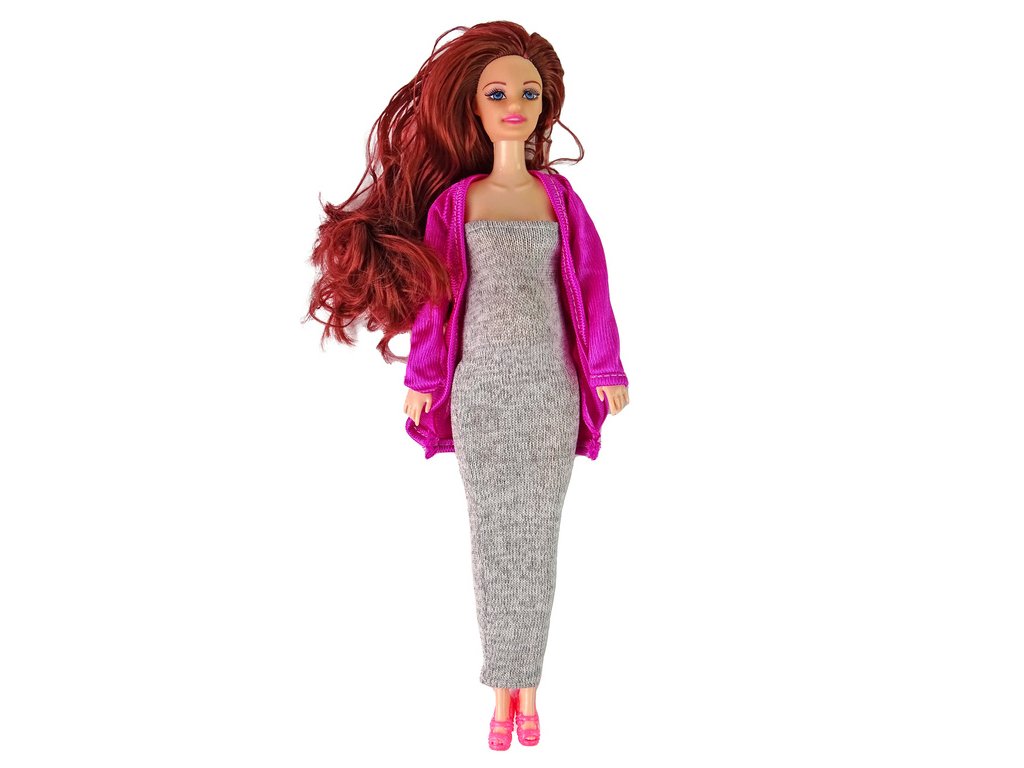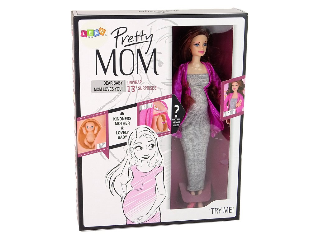 Panenka pro děti v těhotenství s dlouhými vlasy a doplňky Sada panenky v těhotenství, ideální pro malé pečovatele a fanoušky kreativní zábavy! Panenka má hnědé vlasy a modré oči, je oblečena do šedých přiléhavých šatů, růžové mikiny a elegantních růžových bot na podpatku