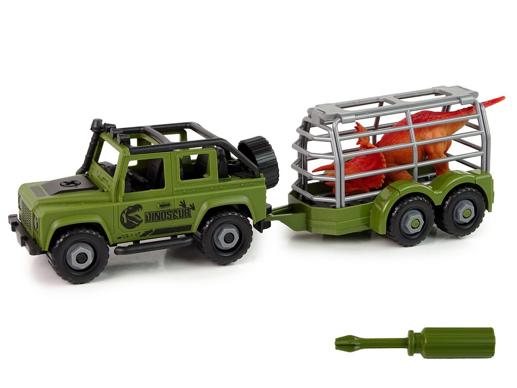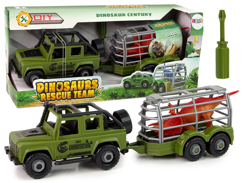 Terénní auto s transportérem k rozmontování DIY Zelený dinosaurus je skvělou volbou pro všechny malé milovníky prehistorických dinosaurů. Pokud má vaše dítě rádo Jurský park a fascinují ho dávná obří stvoření, tento set mu udělá radost. Transportér je připraven k naložení dinosarů a převezení do příslušného místa ve vlastním parku dinosaurů. Dítě nejen rozvine manuální zručnost, ale také logické myšlení a představivost díky možnosti rozmontování a montování vozu. Zelené terénní auto snadno převeze obrovitého plaza a zachrání ho z nebezpečí. Vozidlo je vybaveno šrouby, které spojují jednotlivé části vozidla, a v sadě najdete šroubovák, kterým lze auto rozmontovávat a znovu smontovat. Trénování prstů při utahování šroubů připraví dítě v budoucnu na psaní a rozvine funkce ruky. Přepravní návěs má podobu klece, takže malý objevitel může být klidný, že dinosaurus neuteče a nic se mu nestane. Kdykoli lze návěs odpojit a bavit se samostatným terénním vozidlom.