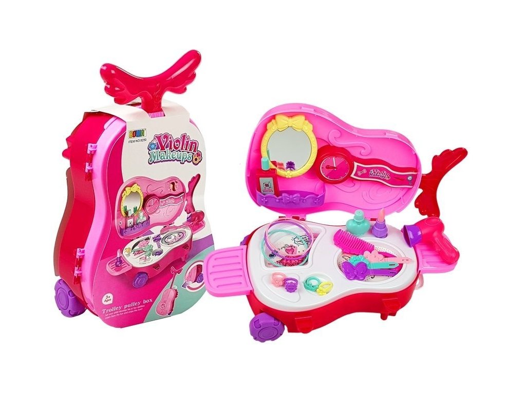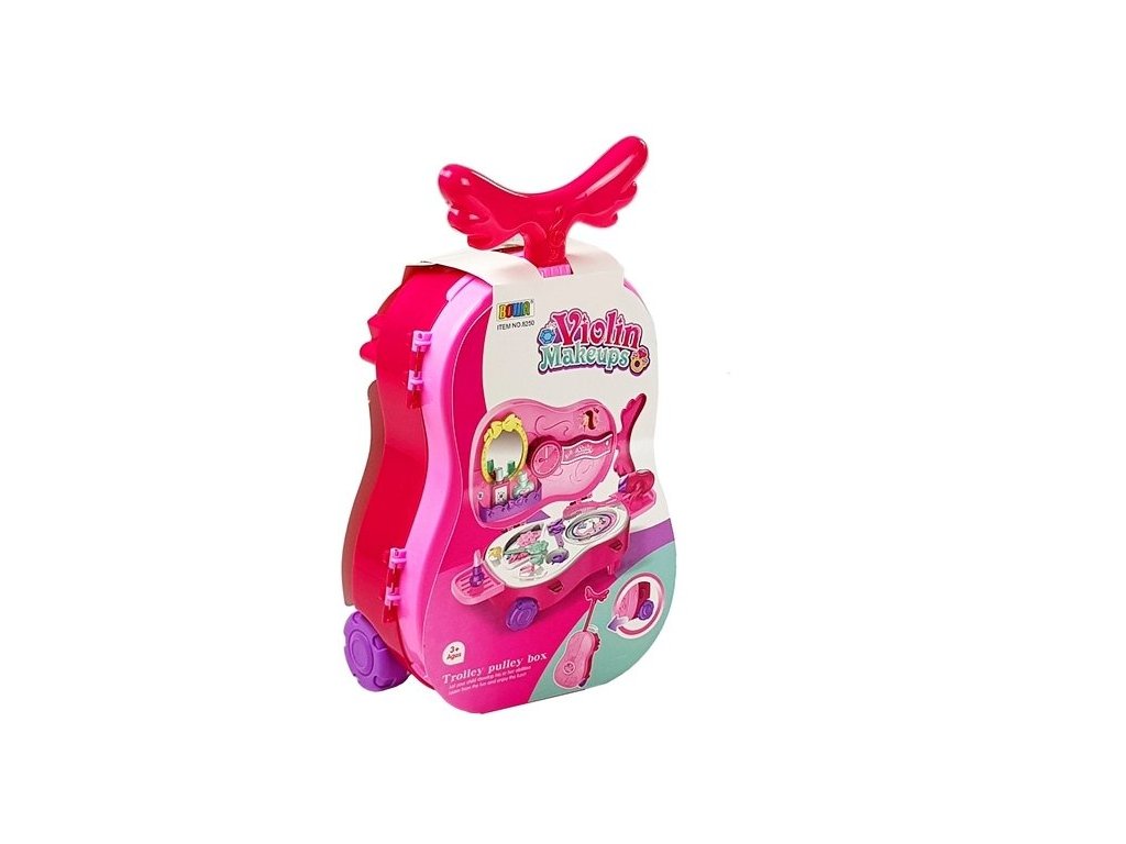 Možnost vžít se do role kosmetičky určitě potěší každou malou princeznu Barevná toaletka má kolečka a rukojeť, což výrazně usnadňuje pohyb dítěte s kufříkem ve tvaru houslí