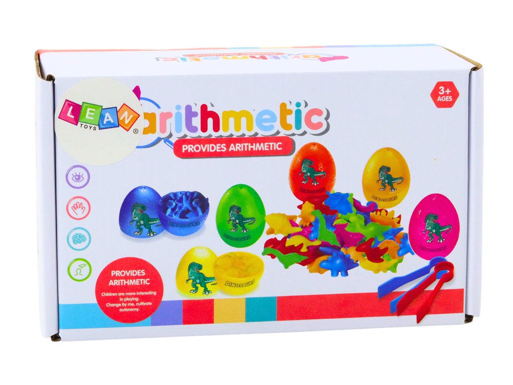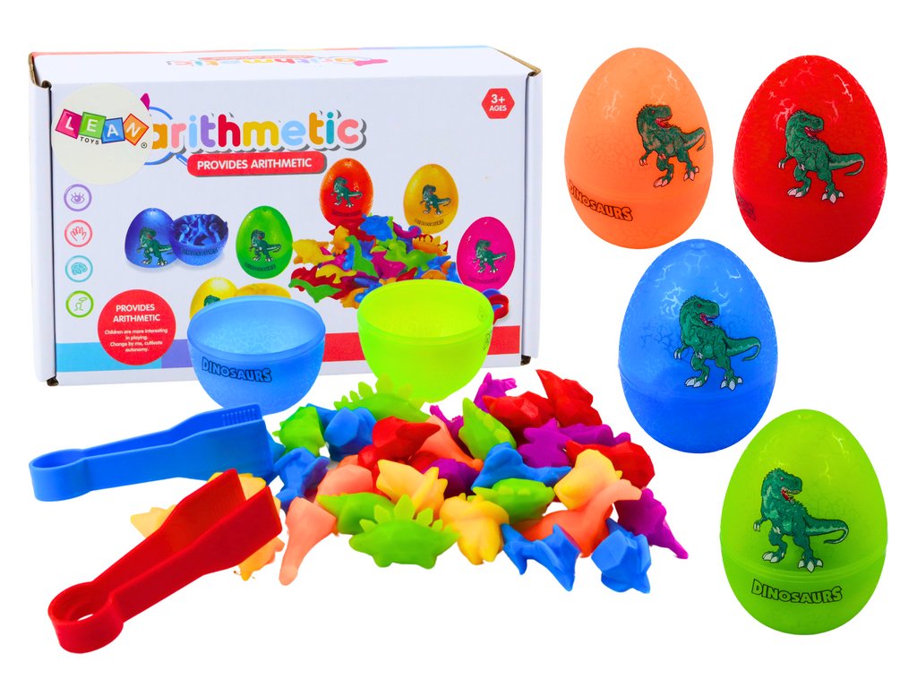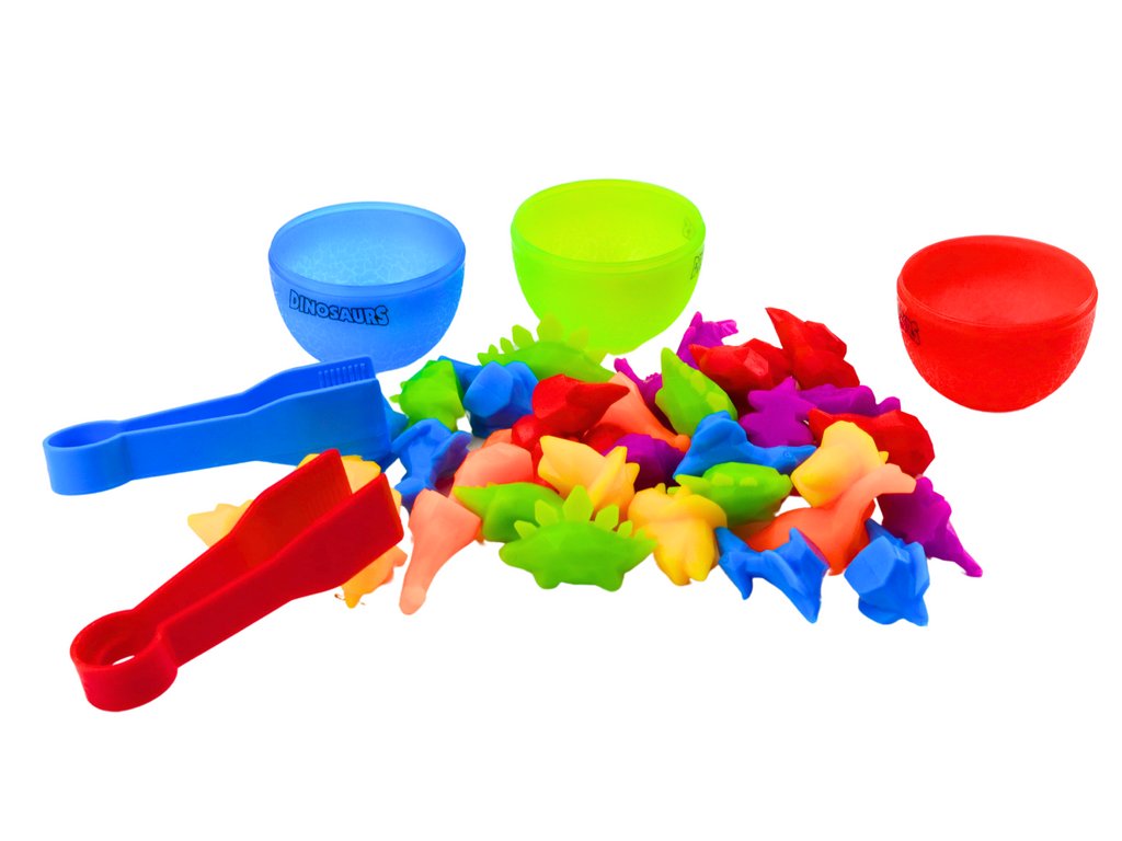 Zábava spočívá v třídění dinosaurů podle barev, což pomáhá učit se rozpoznávání barev a rozvíjí logické myšlení S přiloženými speciálními kleštěmi si dítě může procvičovat úchop a přesné manipulace s předměty, což posiluje svaly rukou a prstů
