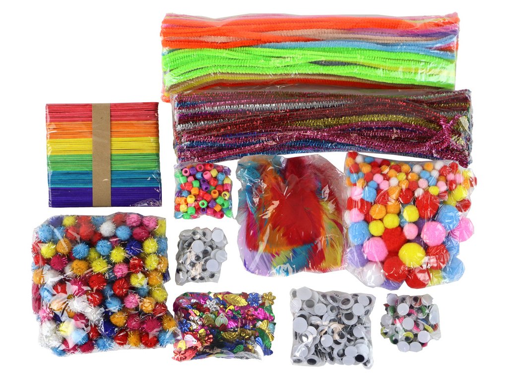 - Zahrnuje rozmanité výtvarné materiály jako drátky, barevná peříčka, bambulky a mnoho dalšího