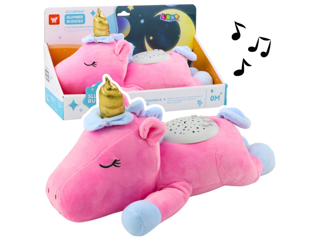 Plyšový růžový jednorožec s projektorem a ukolébavkami je uklidňující hračka pro děti, zejména navržená s ohledem na kojence – vhodná již od prvních dnů života.