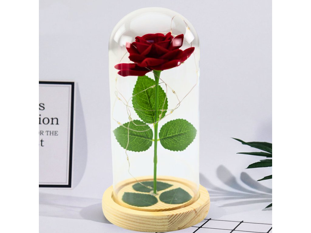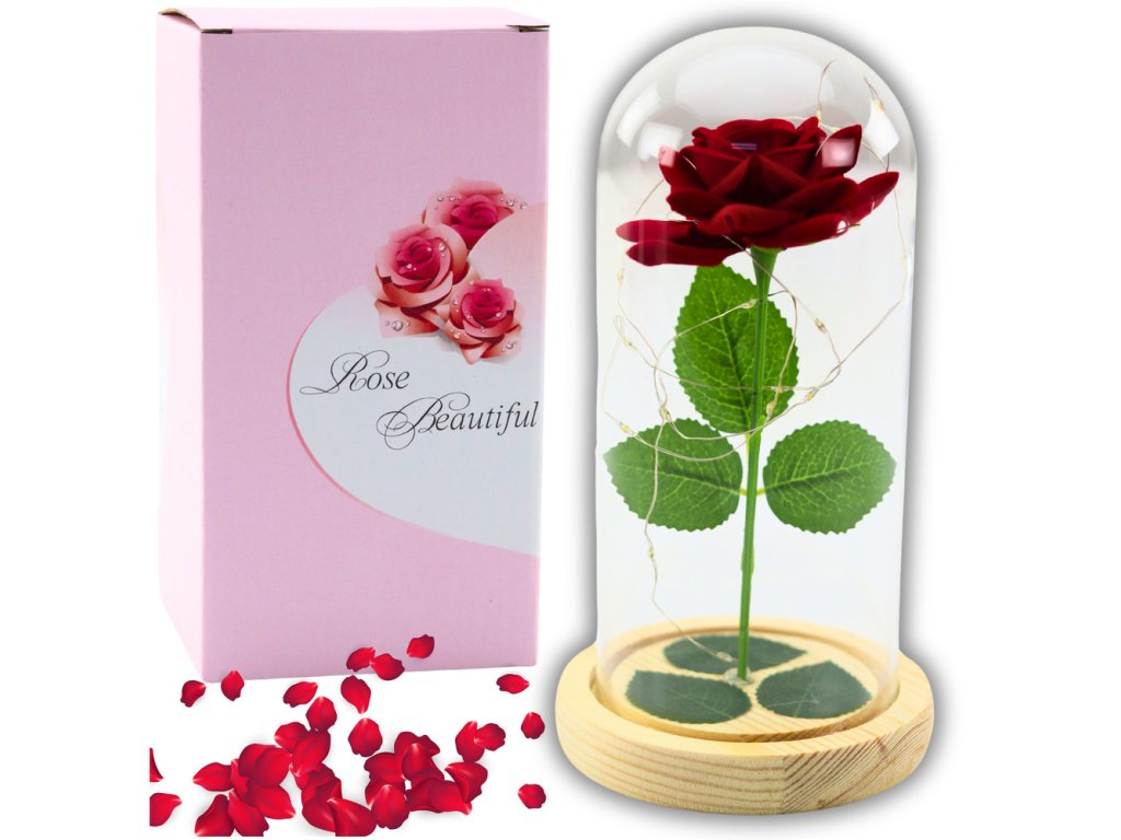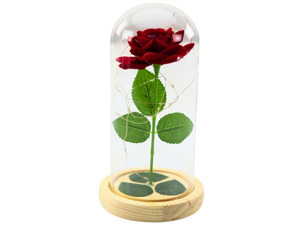 - Umístěná pod skleněnou kopulí a osvětlena jemným LED světlem vytváří romantickou atmosféru, ideální pro výjimečné chvíle