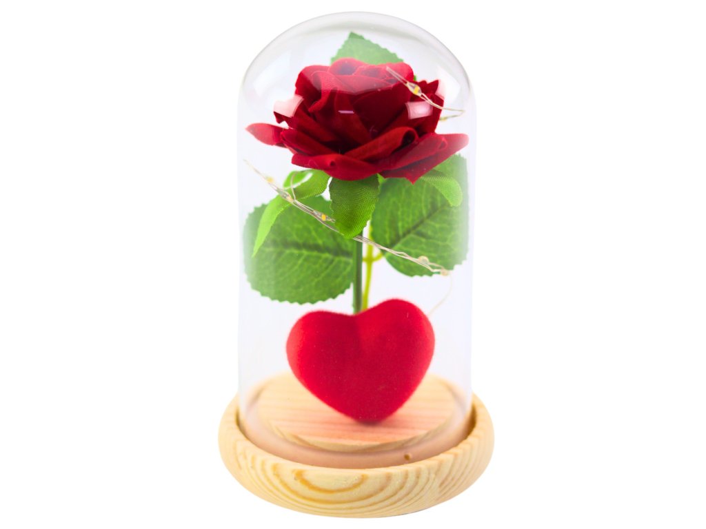 Věčná růže ve skleněné kopuli s LED osvětlením – Červená se srdíčkem je elegantní a symbolický dárek, který vyjádří nejhlubší city a dodá každému interiéru výjimečný charakter.