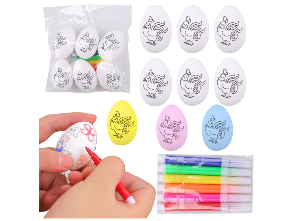 Sada obsahuje 6 polystyrenových vajec s motivem kohouta a fixy v různých barvách, což je ideální pro zábavu doma, ve škole nebo v mateřské škole Ideální pro malování