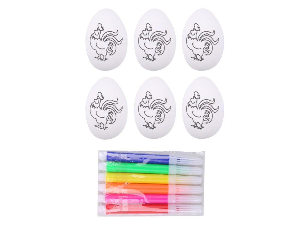 - Sada obsahuje 6 polystyrenových vajec s motivem kohouta a fixy v různých barvách, což je ideální pro zábavu doma, ve škole nebo v mateřské škole