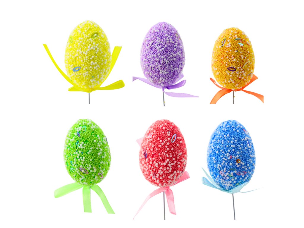 Velikonoční vajíčka na drátku v barevných vzorech jsou skvělým způsobem, jak vyzdobit váš domov na velikonoční svátky Každé vajíčko je pečlivě ozdobeno styroporovými kuličkami a malými vzory, což jim dodává jedinečný charakter