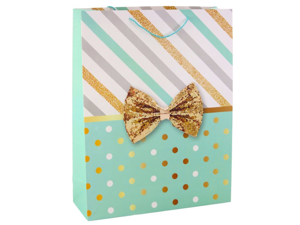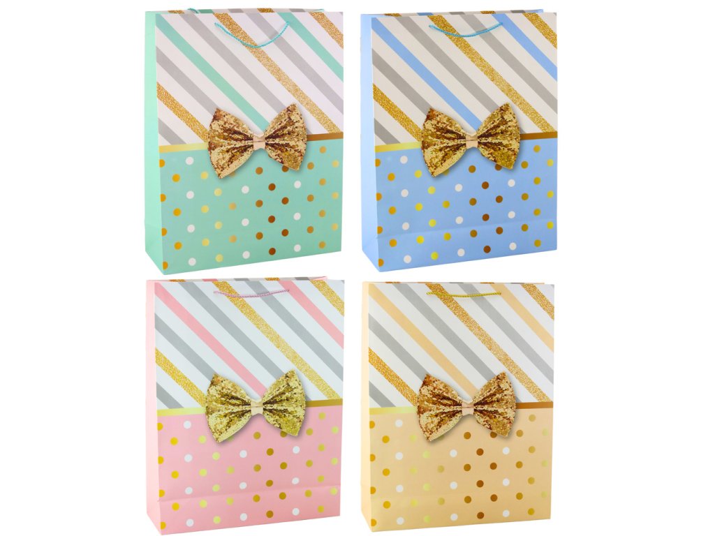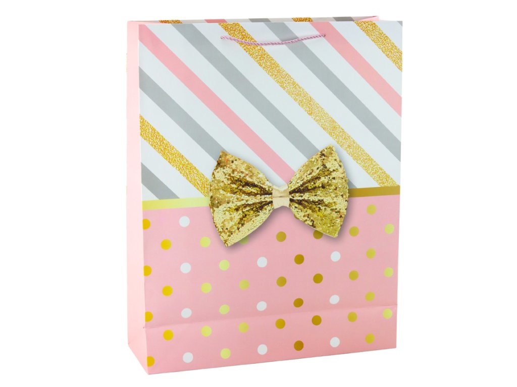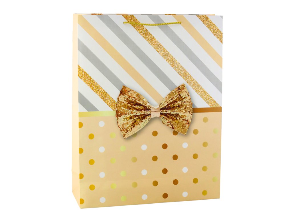 Velká dárková taška s mašlí je elegantním řešením pro balení dárků ve velkoformátovém provedení s unikátním designem kombinujícím pruhy a puntíky se zlatými ozdobami a ozdobnou mašlí.