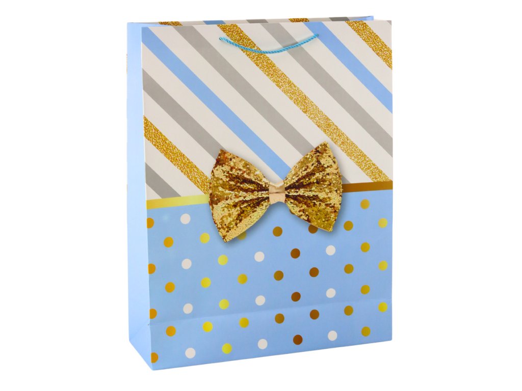 - Velká dárková taška s mašlí je elegantním řešením pro balení dárků ve velkoformátovém provedení s unikátním designem kombinujícím pruhy a puntíky se zlatými ozdobami a ozdobnou mašlí