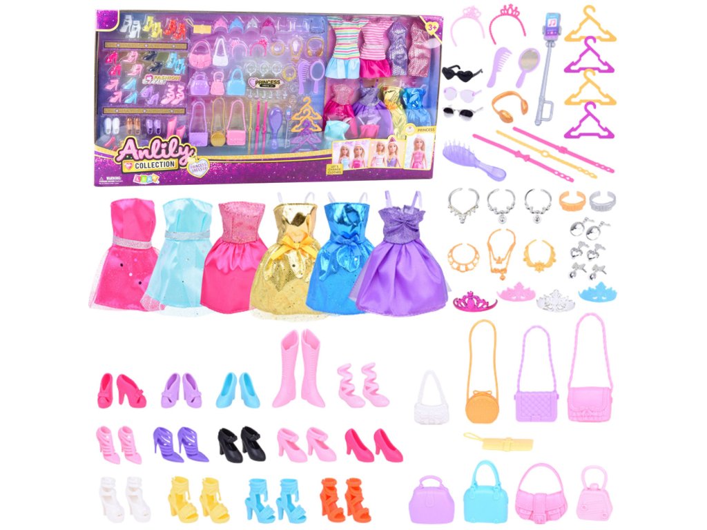 Velká Módní Sada Kolekce Anlily Oblečení Doplňky 65dílná je rozšířená sada oblečení a doplňků, která je ideální volbou pro každou dívku, jež miluje módu a kreativní zábavu s panenkami Tento bohatý komplet obsahuje až 10 výjimečných šatů v různých barvách a střizích, které se skvěle hodí jak pro každodenní, tak pro elegantní panenkové stylizace