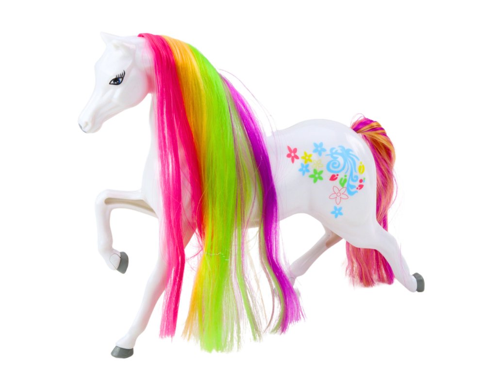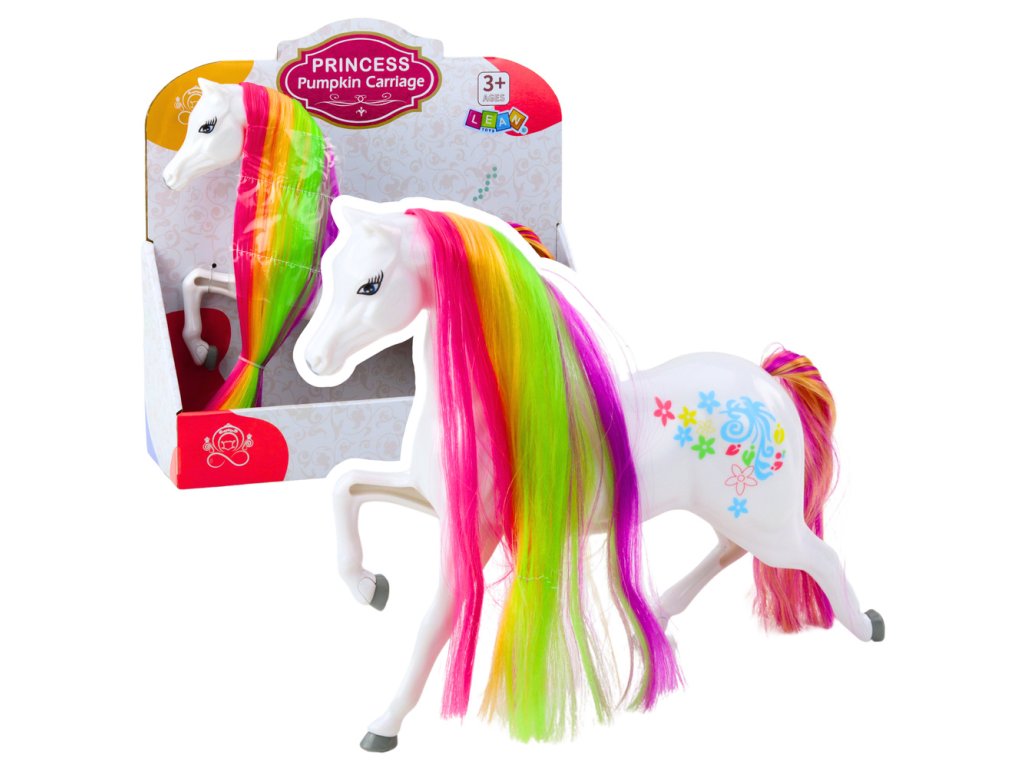 - Velká Pohádková Figurka Koně s Duhohřívou a Barevnými Ozdobami Bílá Kouzelný bílý kůň s dlouhou, barevnou hřívou a ocasem je ideální hračkou pro všechny malé milovníky pohádkových světů
