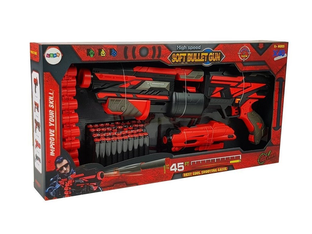 Pistole na pěnové náboje, 40 kusů, červeno-černá muška Pistole jsou hračky, které chce mít každý malý chlapec ve své sbírce.