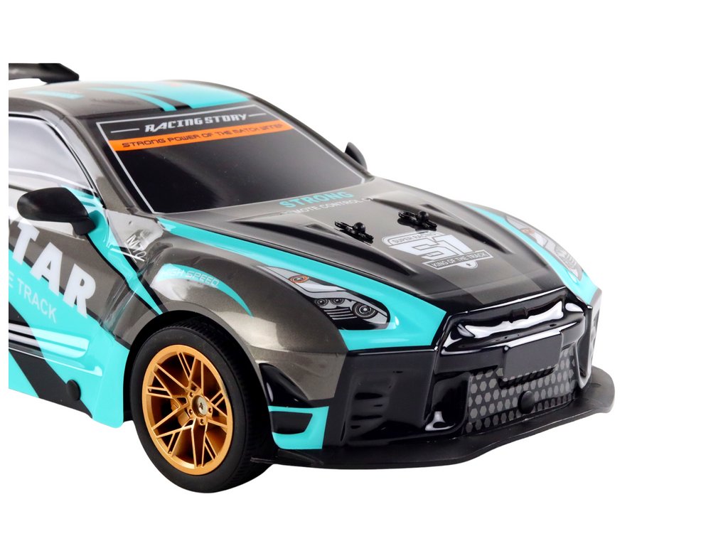 - Vstupte do světa adrenalinu s velkým sportovním RC autem 1:10, jehož dechberoucí tyrkysovo-černý design a zlaté ráfky zaujmou každého milovníka rychlých vozidel