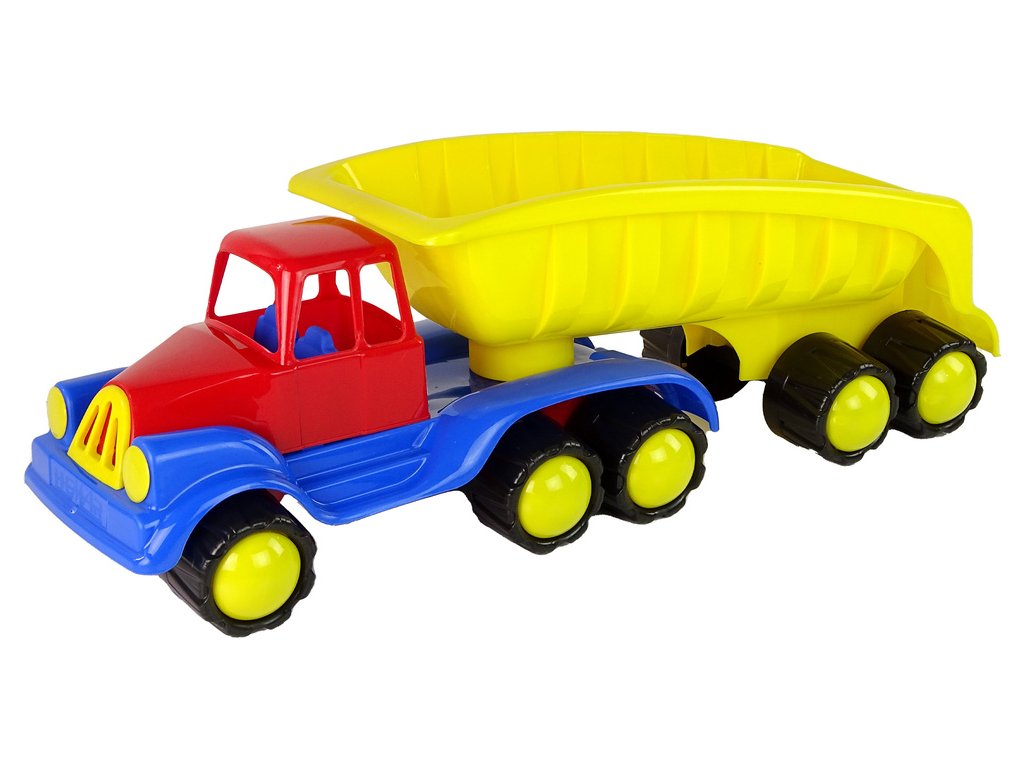 Velké auto s přívěsem 45 cm žluté Tento vůz je dlouhý až 70 cm a má otočný přívěs Díky velké nosnosti může každé dítě přepravovat své nejcennější poklady