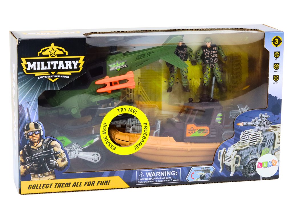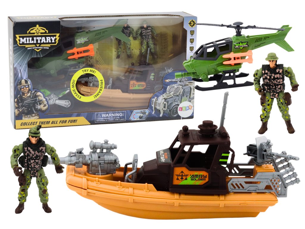 - Tento set zahrnuje figurky vojáků, helikoptéru, terénní motorku a bojovou loď s zvukovými a světelnými efekty, které přenesou malé vojáky do světa napínavých bitev