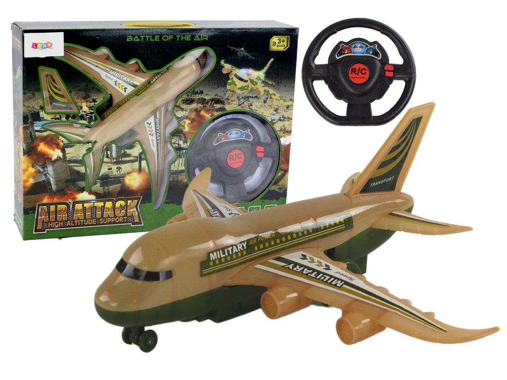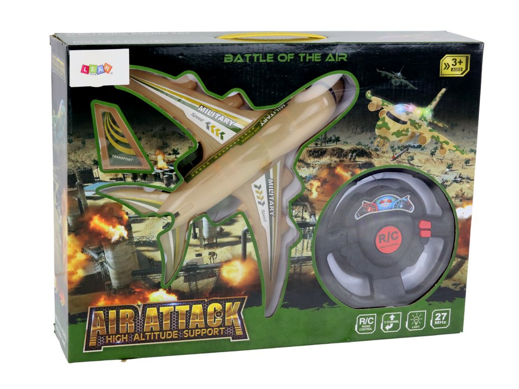 Malby na trupu a křídlech představují detaily inspirované vojenskými vzory, které dodávají hračce autentický a působivý vzhled Součástí balení je dálkové ovládání, které umožňuje přesné řízení letadla