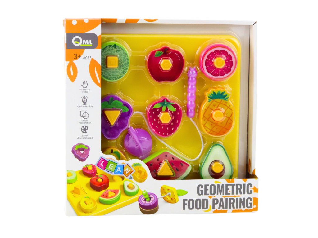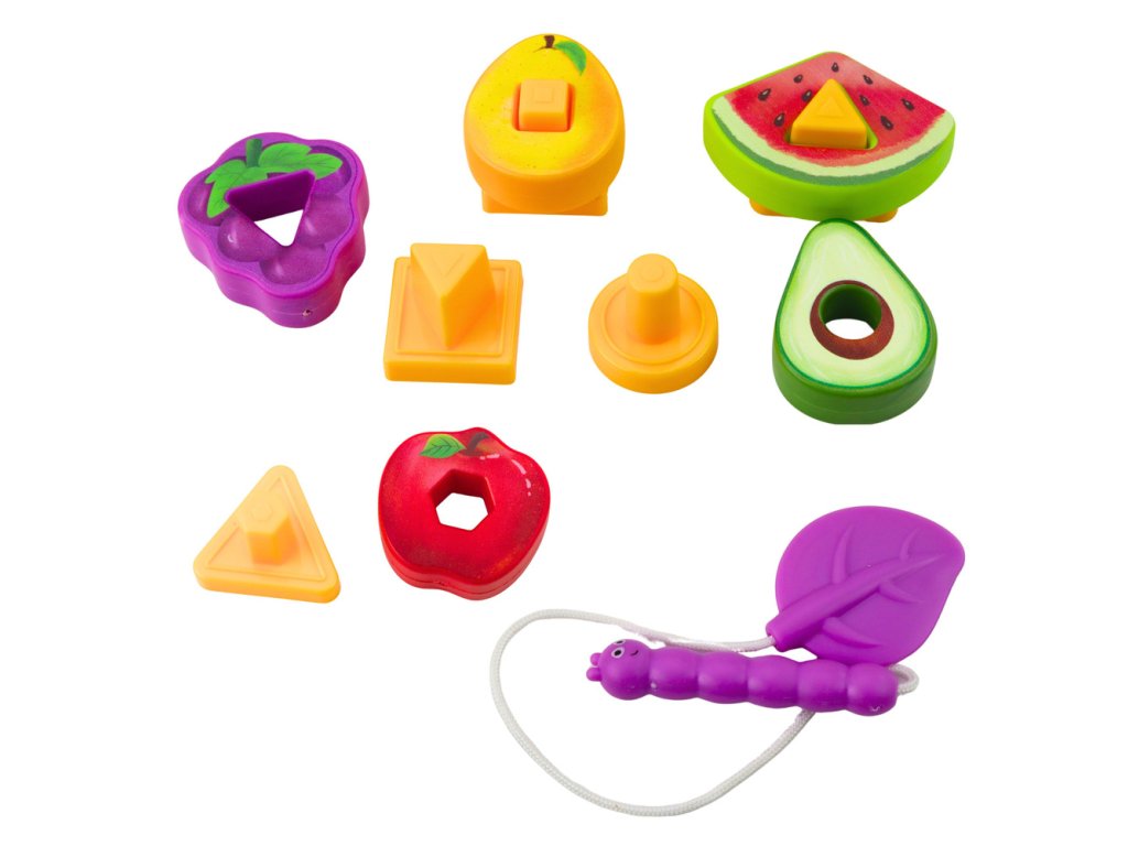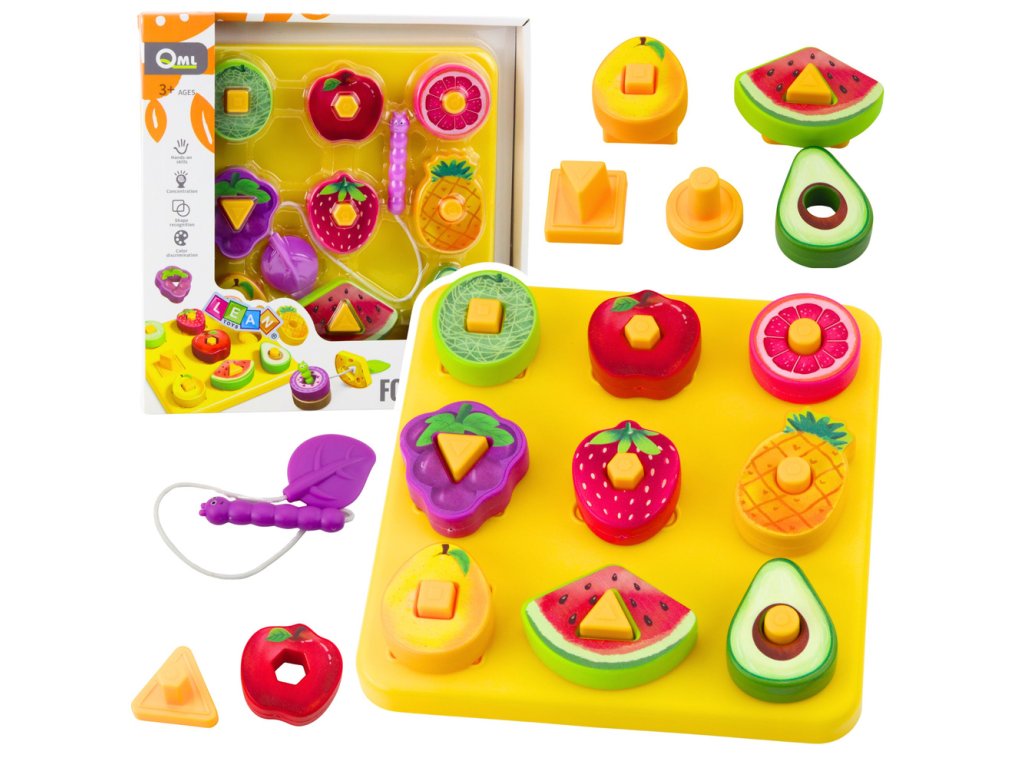 Hračka je vyrobena z bezpečného plastového materiálu, který splňuje všechny normy a poskytuje bezpečnost vašim dětem. Navíc obsahuje drobnou dřevěnou žížalu, kterou děti mohou proplétat otvory v ovoci, čímž si cvičí obratnost. Díky rozmanitým barvám a zajímavému designu děti stimulují svou kreativitu a učí se rozpoznávat různé barvy, tvary a druhy ovoce.