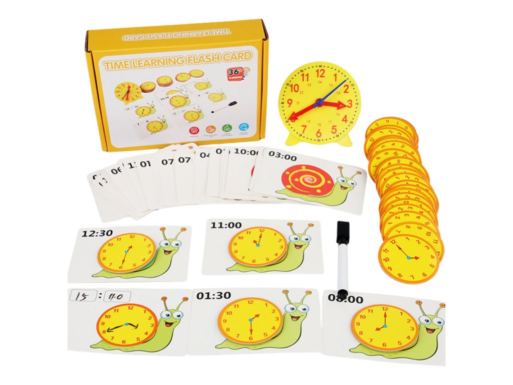 Obsahuje velké hodiny s pohyblivými ručičkami, sadu edukačních karet s ilustracemi šneka a hodin, a také suchostíratelný fix pro opakované použití Sada se ideálně hodí pro domácí použití, do školky nebo do základní školy jako doplněk k lekcím matematiky nebo pro rozvoj poznávacích schopností