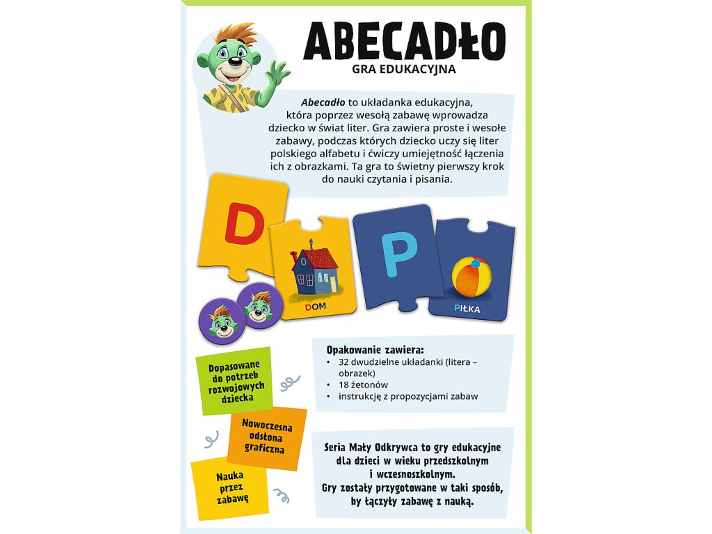 Tato poutavá skládačka je určena pro předškolní děti a přístupným způsobem je uvede do světa písmen Prostřednictvím hry se malí objevitelé naučí rozpoznávat písmena české abecedy a spojovat je s obrázky