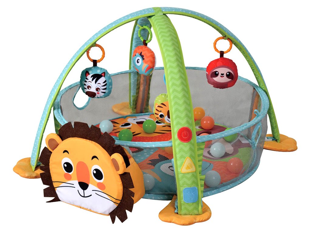 Měkká deka s živými barvami jistě zaujme i to nejneklidnější miminko. Lev může fungovat jako praktický úložný prostor pro míčky. Vzdělávací hrací deka rozvíjí představivost, učí rozlišovat tvary a barvy a zdokonaluje smysly dotyku a zraku. Když se vaše dítě pokouší uchopit zavěšené hračky, při pokusech o první kroky může využít ohrádku s míčky. Boční síťka pak vytváří bezpečný prostor pro hraní.