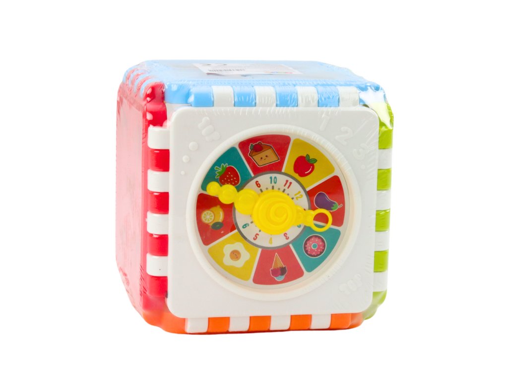 Díky různorodým stěnám s úkoly má dítě mnoho možností k objevování, porovnávání a experimentování Na každé straně kostky se nachází jiná aktivita: hodiny s pohyblivými ručičkami, třídička tvarů a čísel, a také grafiky a prvky stimulující smysly