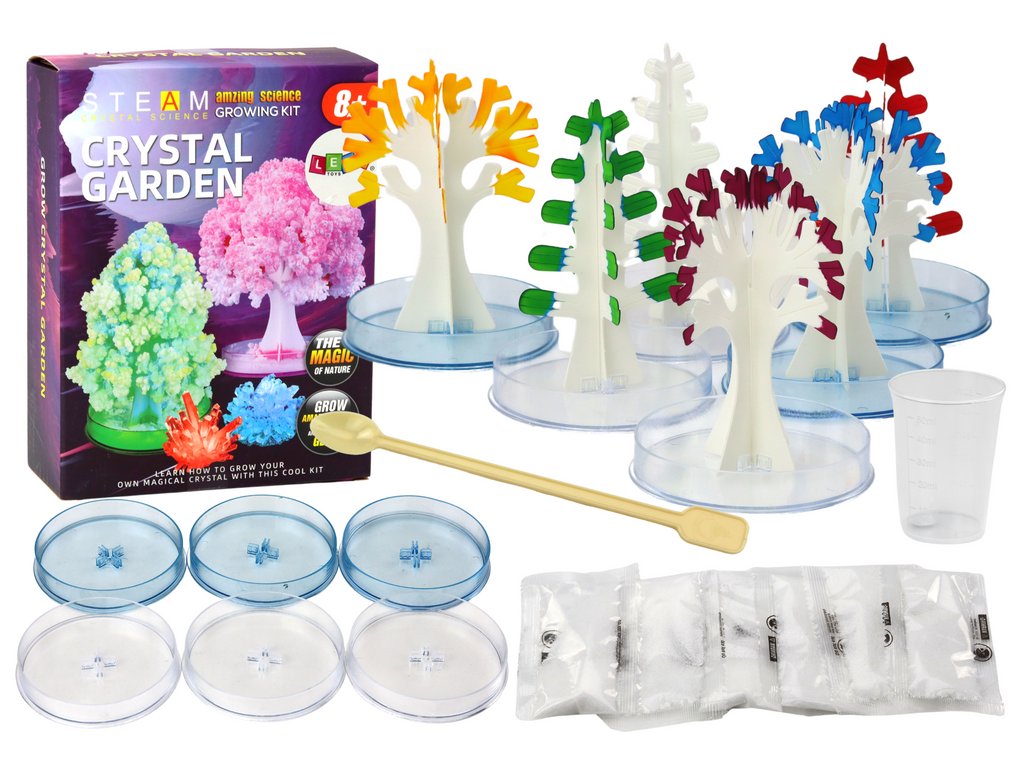Díky nástrojům zahrnutým v sadě může malý chemik experimentovat a vytvářet vlastní krásné krystaly připomínající úžasné stromy Tento proces nejen fascinuje děti, ale také pomáhá pochopit základní chemické principy